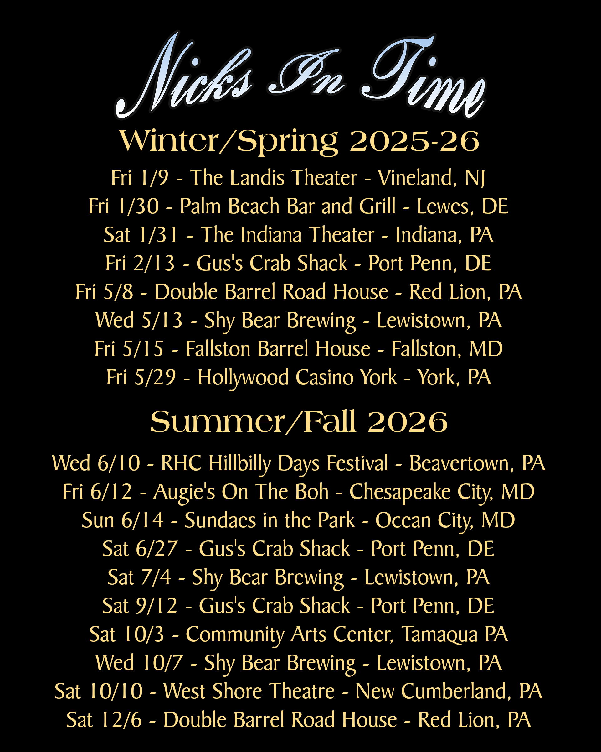 Event ScheduleAt A Glance Fall / Winter 2025 Tour Friday, January 9, 2026 The Landis Theater 830 E. Landis Ave. Vineland, NJ 08360 More Info Get Tickets Friday, January 30, 2026 Palm Beach Bar & Grill 18585 Coastal Hwy #23, Rehoboth Beach, DE 19971 More Info Saturday, January 31, 2026 The Indiana Theater 637 Philadelphia St, Indiana, PA 15701 More Info Friday, February 13, 2026 Gus’s Crab Shack 29 W Market St., Port Penn, DE 19731 More Info Friday, May 8, 2026 Double Barrel Road House 3290 Cape Horn Rd., Red Lion, PA 17356 More Info Wednesday, May 13, 2026 Shy Bear Brewing Company 35 Meadowbrook Ln, Lewistown PA 17044 More Info Friday, May 15, 2026 Fallston Barrel House 2403 Belair Road, Fallston, MD 21047 More Info Friday, May 29, 2026 Hollywood Casino - York 2899 Whiteford Rd, York, PA 17402 More Info Summer / Fall 2026 Tour Wednesday, June 10, 2026 RHC Hilbilly Day Festival 222 S Sassafras St., Beavertown, PA 17813 Friday, June 12, 2026 Augie’s on the Boh 237 Bohemia Manor Farm Ln, Chesapeake City, MD 21915 More Info Sunday, June 14, 2026 Sundaes in the Park Northside Park, 200 125th St, Ocean City, MD 21842 More Info Saturday, June 27, 2026 Gus’s Crab Shack 29 W Market St., Port Penn, DE 19731 More Info Saturday, July 4, 2026 Shy Bear Brewing Company 35 Meadowbrook Ln, Lewistown PA 17044 More Info Saturday, October 10, 2026 West Shore Theatre 317 Bridge St, New Cumberland, PA 17070 More Info Saturday, September 12, 2026 Gus’s Crab Shack 29 W Market St., Port Penn, DE 19731 More Info Saturday, October 3, 2026 Tamaqua Community Arts Center 125 Pine St., Tamaqua, PA 18252 More Info Wednesday, October 7, 2026 Shy Bear Brewing Company 35 Meadowbrook Ln, Lewistown PA 17044 More Info Saturday, December 6, 2026 Double Barrel Road House 3290 Cape Horn Rd., Red Lion, PA 17356 More Info Check back often for more events! Explore Our Previous Appearances - Past Events